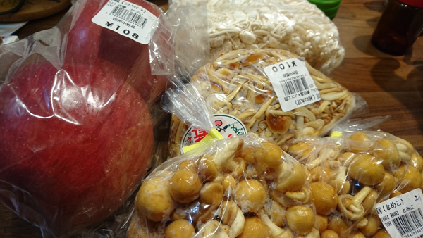 購入したりんごときのこ その他にも野沢菜・ほうれん草・長ネギなどなど・・・ |