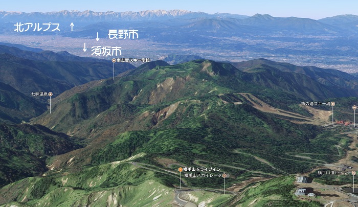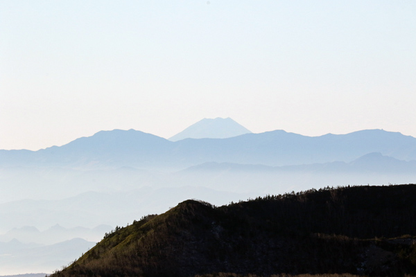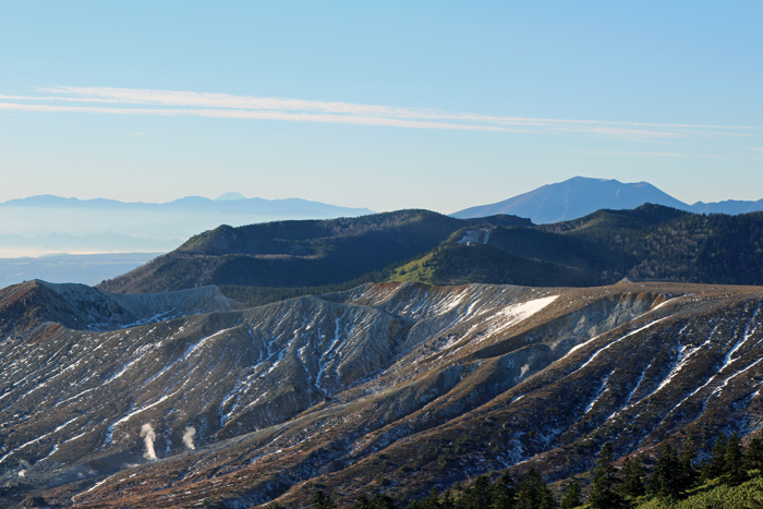 山肌から噴煙をあげる「草津白根山」 右奥は「浅間山」遠くに「富士山」も展望出来ます。 |