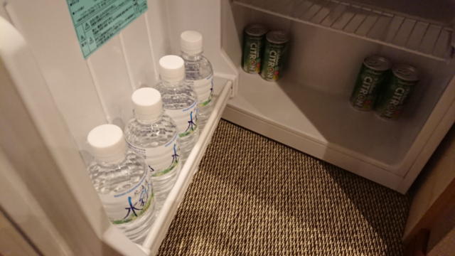 冷蔵庫内の飲み物はサービス お水と北海道限定リボンシトロンが人数分 |