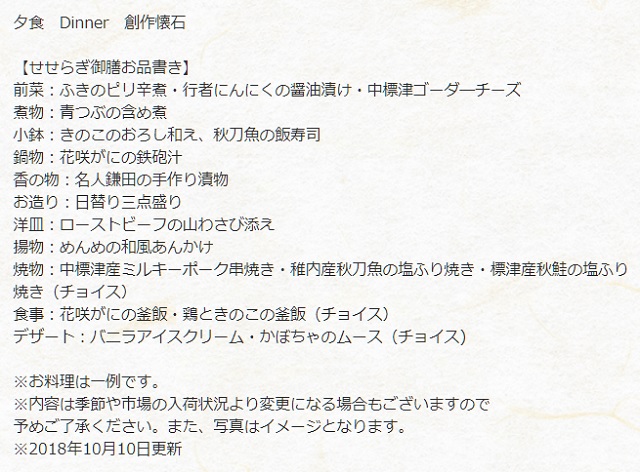 夕食は「せせらぎ御膳」 ※内容は一部変更 |