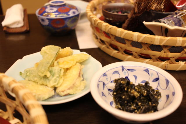 自由に取って来れるバイキング形式の 天ぷらとつけもの |