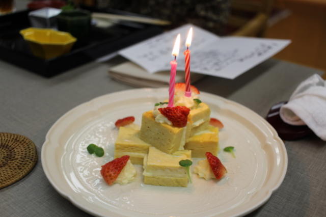 義母の米寿のお祝いに 卵焼きで作ったケーキをプレゼントしてくださいました。 |