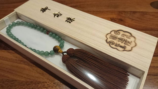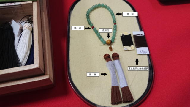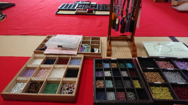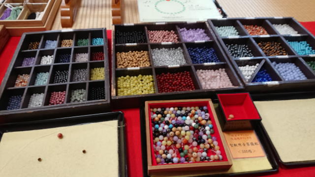 出来上がったら、1つずつ糸に石を通し、 お寺の方が最後に結んで止めてくださいます。 最終的にボンド止めをするそうなのですが、 接着するまで2時間はつけないでくださいとのこと。 |