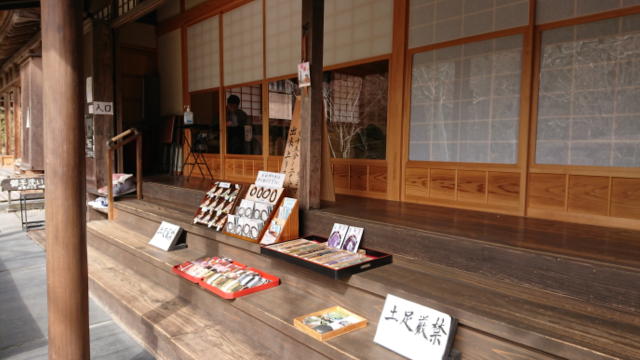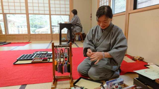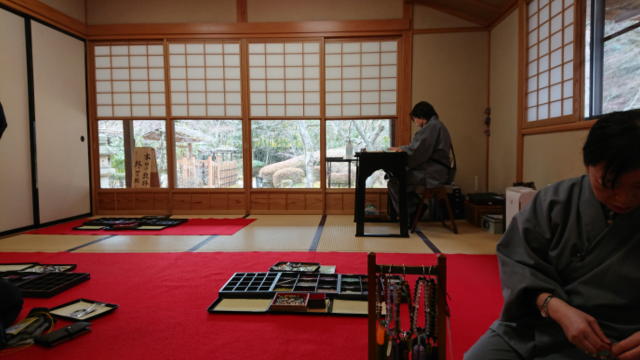本堂(左)の隣で数珠作りをします | |||||||||||||