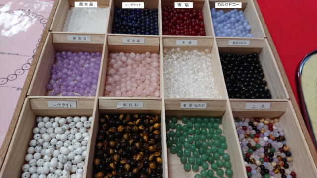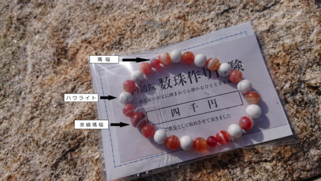 完成したものを袋に入れて渡されます。 親玉:赤縞瑪瑙 二天:瑪瑙 主玉:赤縞瑪瑙・ハウライト 最後にそれぞれの石の意味を教えてくださいます。 「うんうん、まさしく私にぴったり!」と思ってしまうほど納得! 行く前は違う石で作ろうと思ってたのに実際にその場に行くと 選んだのは別の天然石 その時の気持ちが石に現れるようです(^-^;