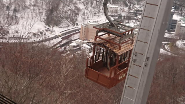 ゴンドラへ鮭を吊るし、寒干ししてトバを作ってます。