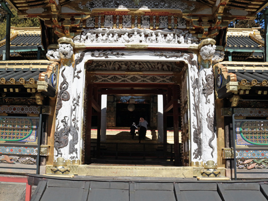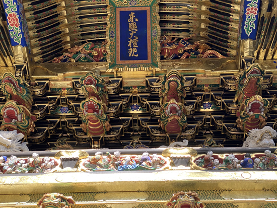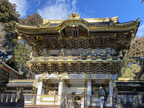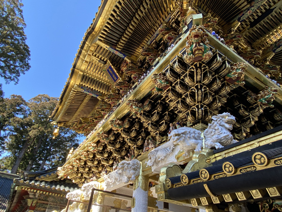 【陽明門】 国宝 いつまで見ていても見飽きないところから「日暮の門」ともよばれ、 故事逸話や子供の遊び、聖人賢人など500以上の彫刻がほどこされています。 -日光東照宮HPより- |
