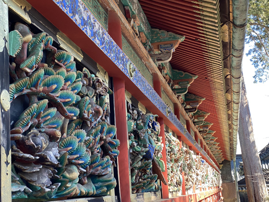 【廻廊(かいろう)】 国宝 外壁には我が国最大級の花鳥の彫刻が飾られています。 いずれも一枚板の透かし彫りには、極彩色がほどこされています。 -日光東照宮HPより- |