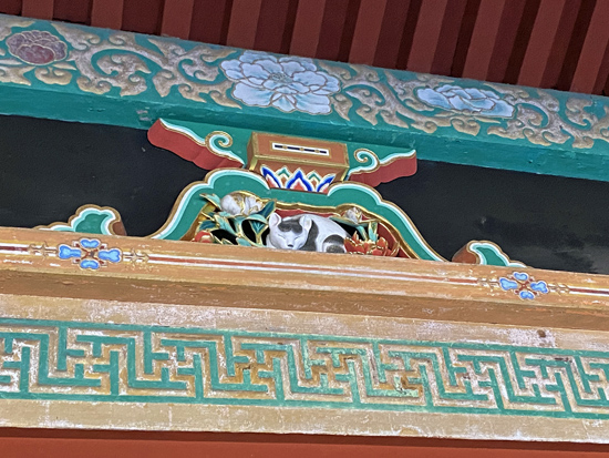 【眠り猫】 国宝 左甚五郎作と伝えられています。 牡丹の花に囲まれ日の光を浴び、 うたたねをしているところから 「日光」に因んで彫られたとも言われています。 -日光東照宮HPより- |