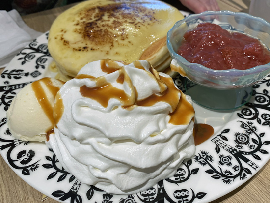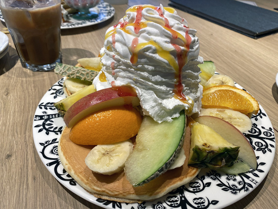 【いちごの里カフェ日光店】 季節のフルーツパンケーキ ここでこれが食べたいために昼食は軽めに・・・(^_^;) 生クリームは量がありそうですが、フワッとしているので 軽い感じでわりと食べられちゃいます。 1人では食べきれないので夫に手伝ったもらい完食しました(^^)v |