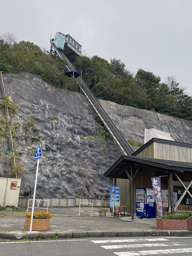 高さ100mの回転昇降展望塔「パノラマタワー」が点検で止まっていたため しかたがなく「弥彦山クライミングカー」に乗ったが 古いのと坂が急なので怖い怖い!!(^_^;) クライミングカーと言えども斜めに動いているエレベーターの ようなものだそうです。 |