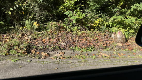 7:54 ドラゴンドラ山麓駅手前でニホンザルが朝食中~♪ 親子のニホンザル (後に車が居たので走りながら走行) |