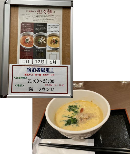 ということで、宿泊者限定で 無料で頂ける「担々麺」を ラウンジまで食べに(*^_^*) スープは美味しかったが麺がそうめんみたいな 細い面で今一だったのが残念 |