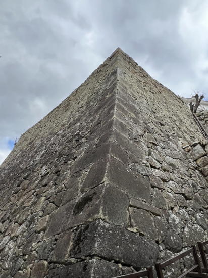 10:49 扇の勾配(備前丸石垣) 算木積みで積み上げられた角部分が扇の勾配 と呼ばれる美しい曲線を描いています。 傾斜角度は下の方は65度で上は70度 |