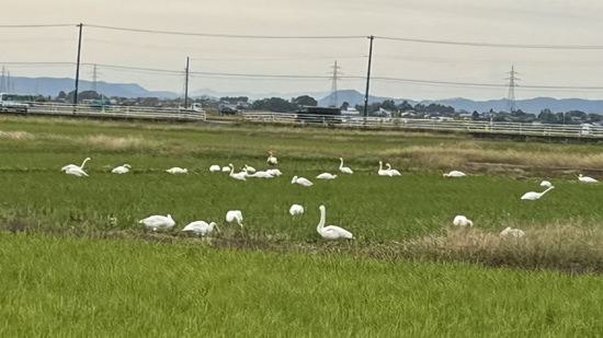 福島潟の近くを通ると畑にハクチョウがたくさん